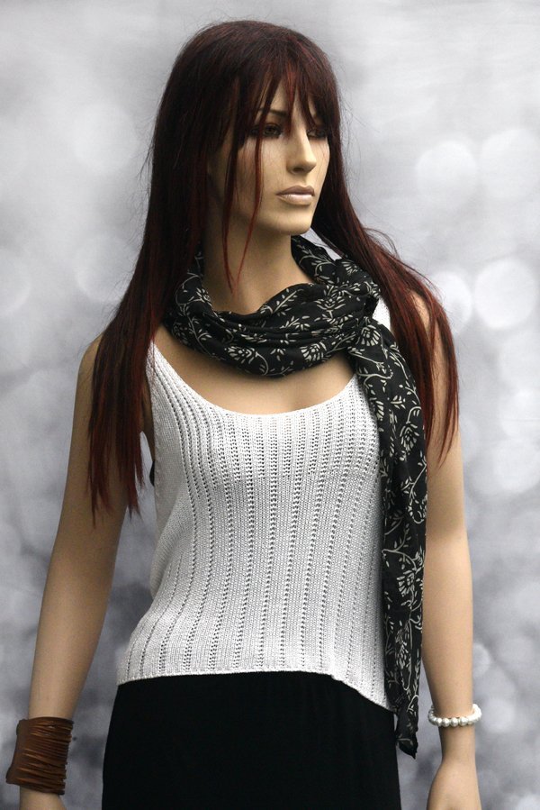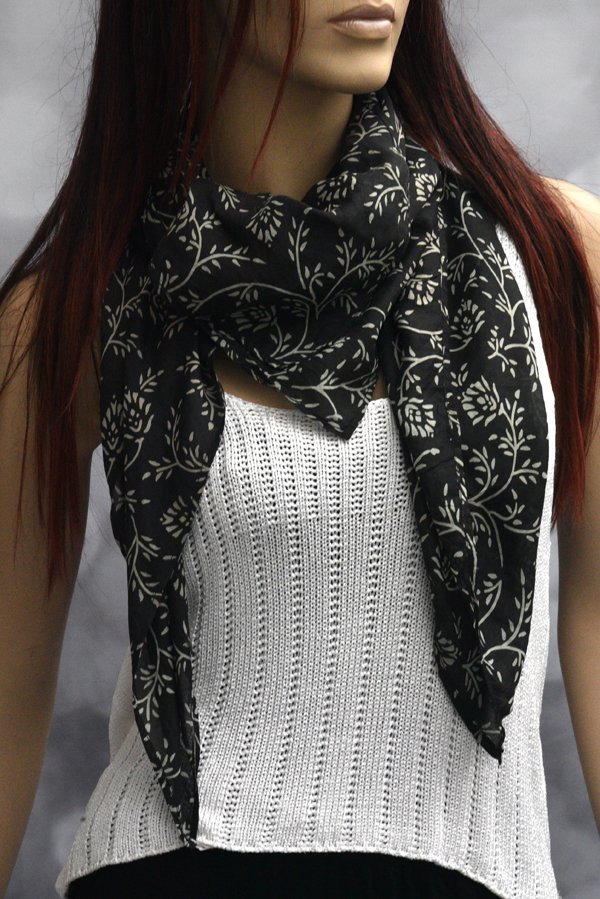 Zwarte zijden vierkant sjaaltje met witte print van gestileerde bloemetjes, het lijkt een beetje op die beroemde bloemenprintjes van Laura Ashley vind ik. Leuk om in een driehoek te dragen op allerlei manieren. Afmeting 100 x 100 cm.